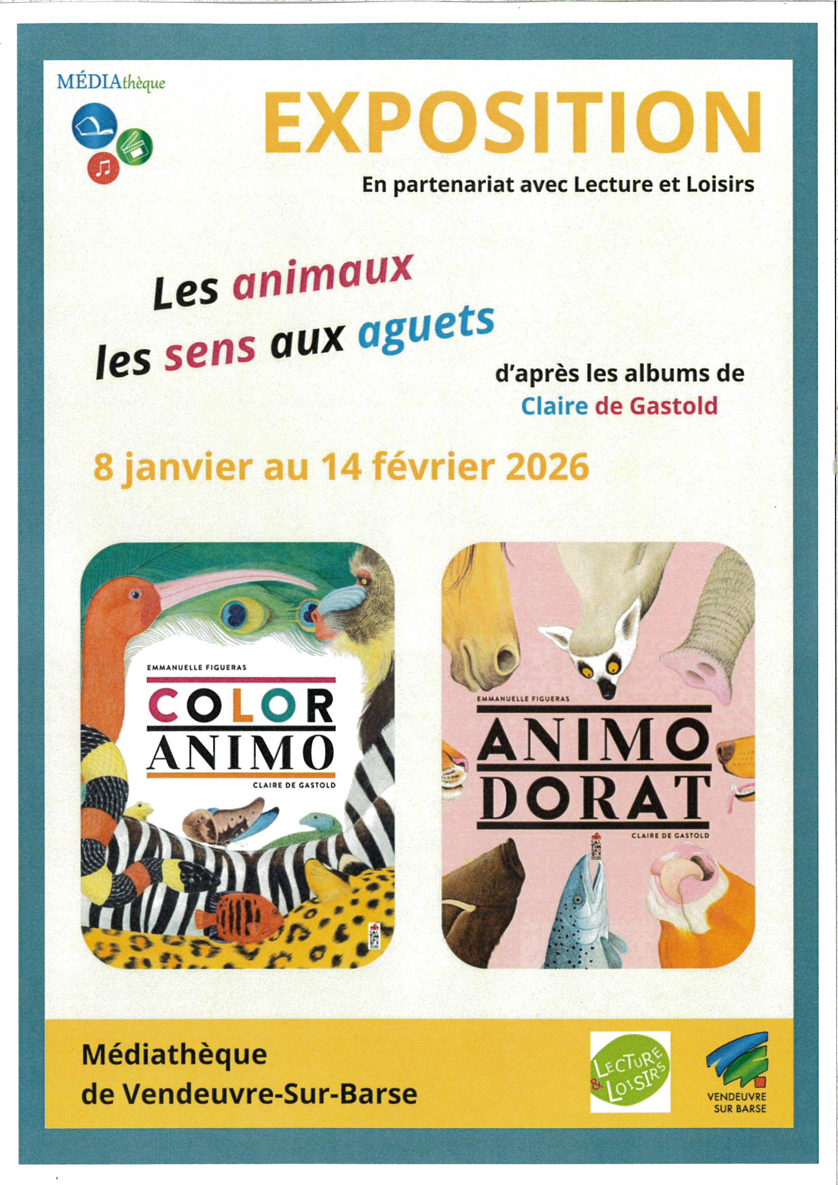 Du 08 janvier au 14 février 2026 à la médiathèque, exposition en partenariat avec Lecture et Loisirs, " les animaux les sens aux aguets" d'après les albums de Claire de Gastold.